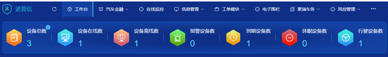 数据项:设备总数、在线数量、报警数量、离线数量、行驶数量、过期数量。