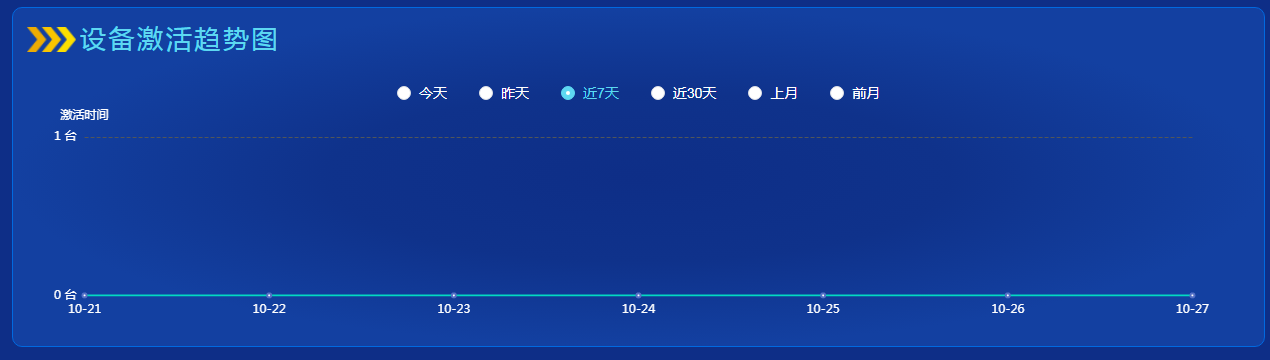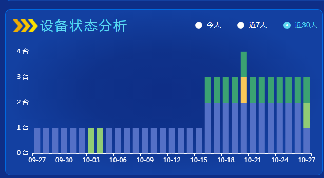 操作:可通过选项卡切换查看 “今天”、“7天”、“30天” 内的设备在线量、报警数量、离线数量的统计变化。