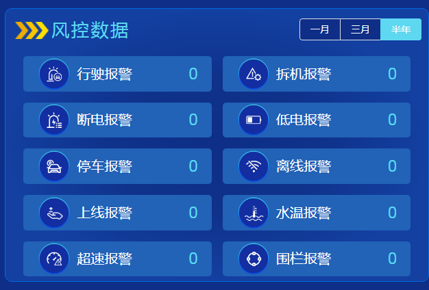 数据项:可重点关注:“围栏报警” “车架号不一致报警”等统计信息。