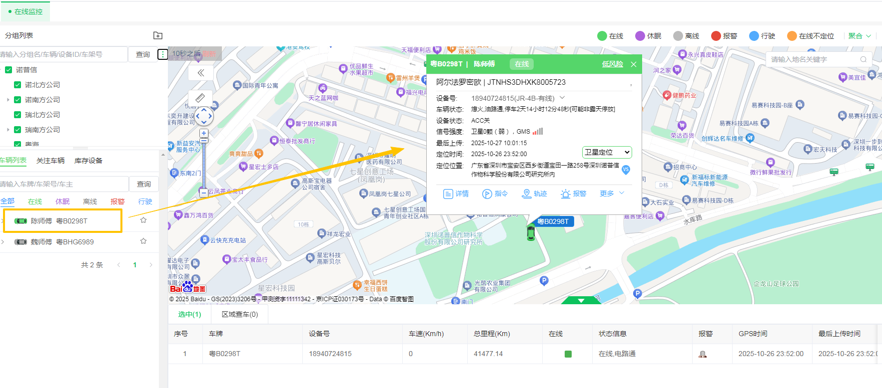 操作:点击顶部状态选项卡(如 全部、在线、离线、报警、行驶),可快速筛选并查看对应状态的车辆。