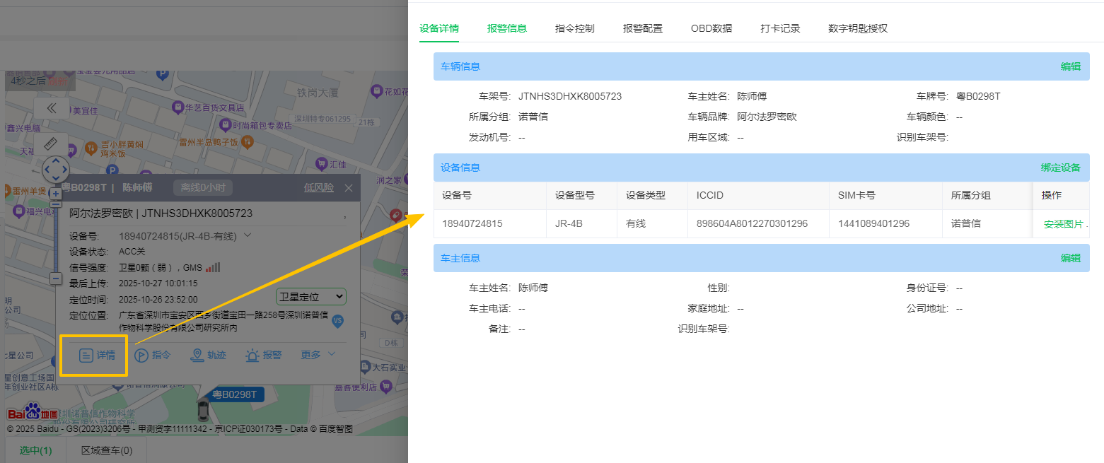 功能:弹出窗口,查看更全面的车辆基本信息、设备信息及安装信息。