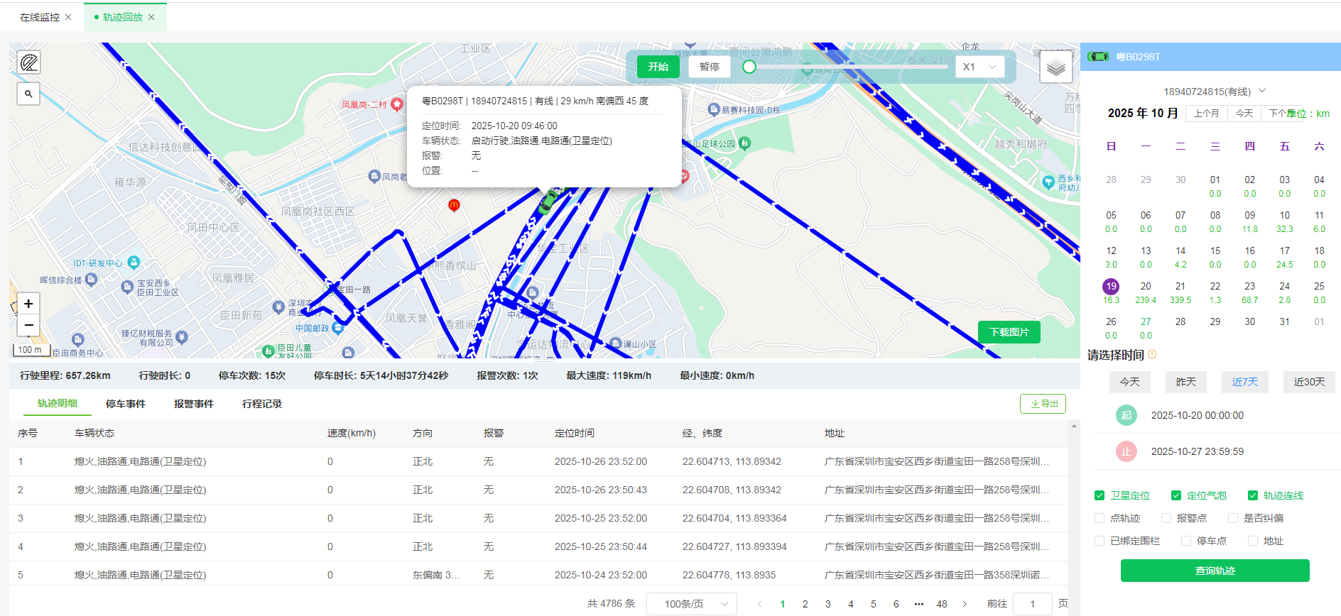 - 报警联动:在回放轨迹时,地图上会显示在该时间段内触发的报警点(如车架号不一致报警、进出围栏报警)。