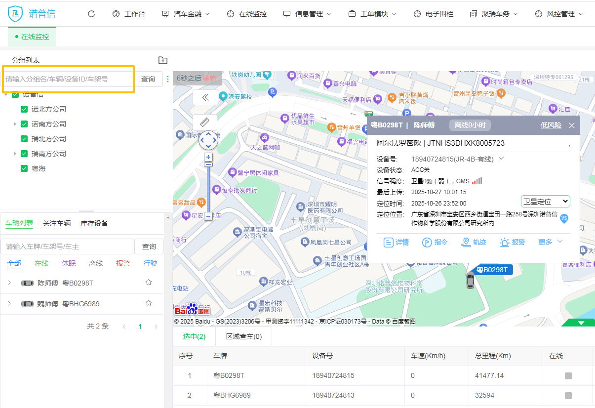 筛选条件:支持按车牌号、车架号、设备号、所属部门/分组等多种条件进行筛选。