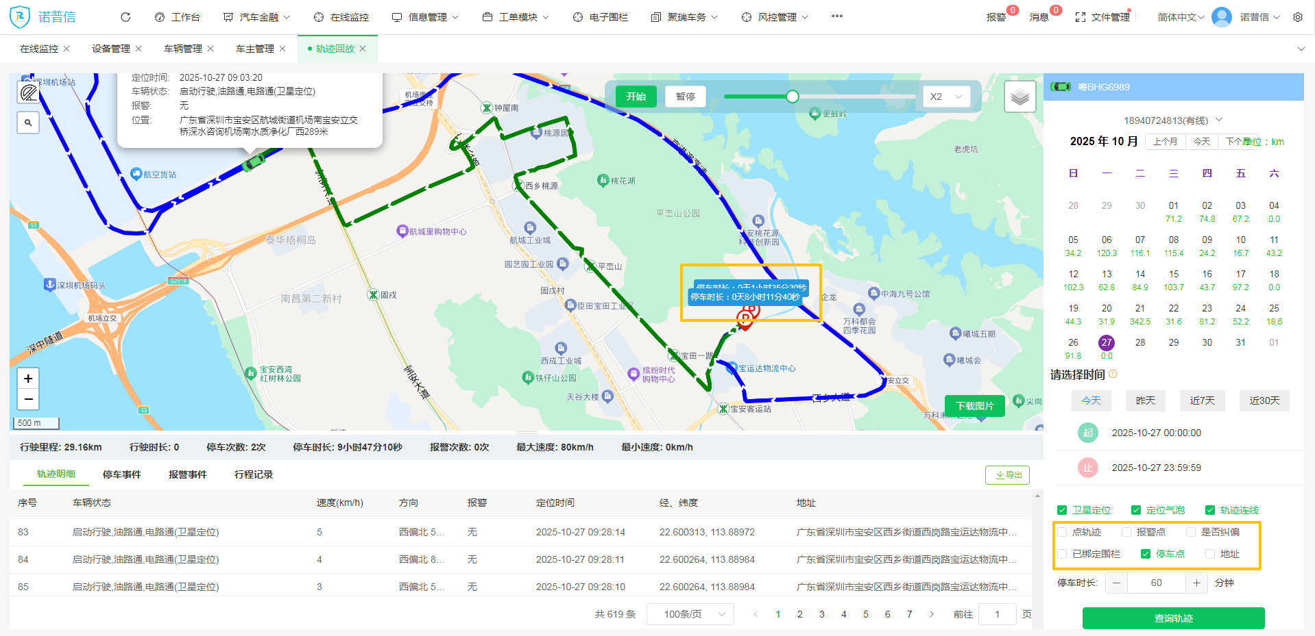 如:勾选 停车点/报警点 等查询,轨迹地图中可显示“停车点”及“报警点”标示