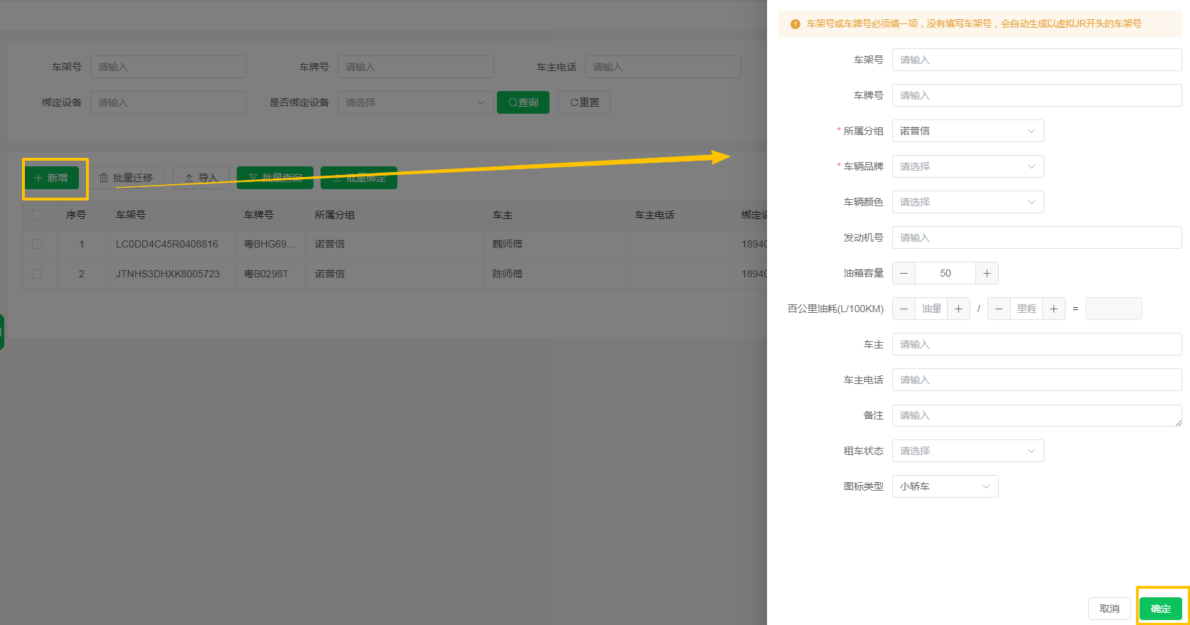 新增车辆:点击 【新增】,填写车架号和车牌号(至少填一项)、所属分组、车辆品牌等信息。