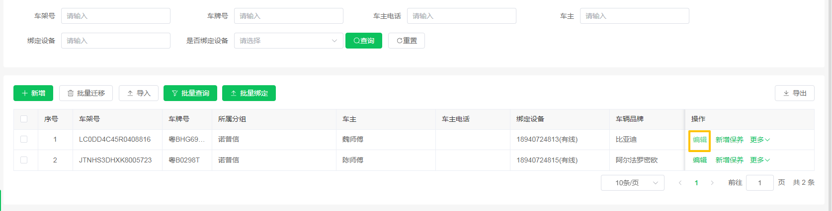 编辑车辆:在车辆列表中点击对应车辆的 【编辑】 按钮进行修改。