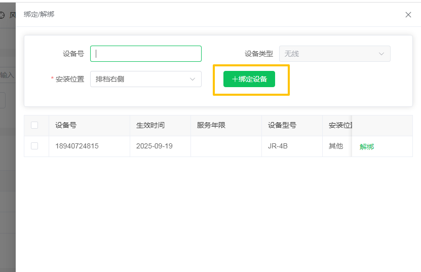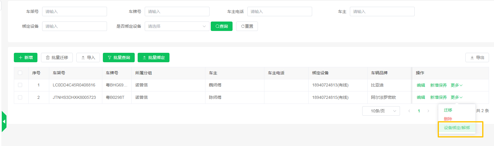 绑定/解绑设备:在车辆列表的 【更多】 操作中,选择 【设备绑定/解绑】,为车辆关联或解除关联设备。
