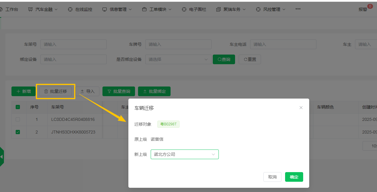 *注意:车辆迁移部门后,其绑定的设备会自动更新至新部门。
