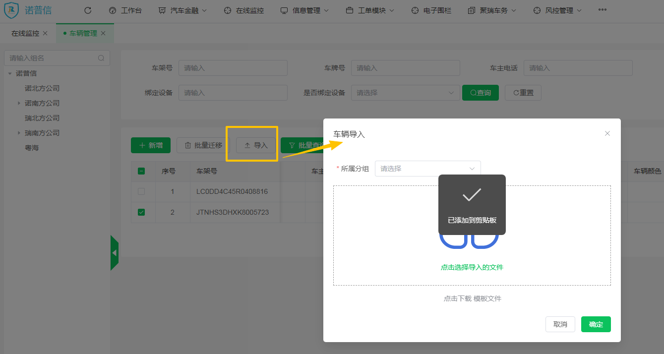 目的:一次性录入大量车辆信息、设备信息(前期大量录入车辆和设备数据时可使用该功能)