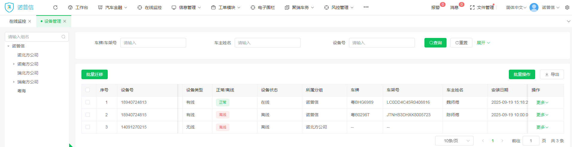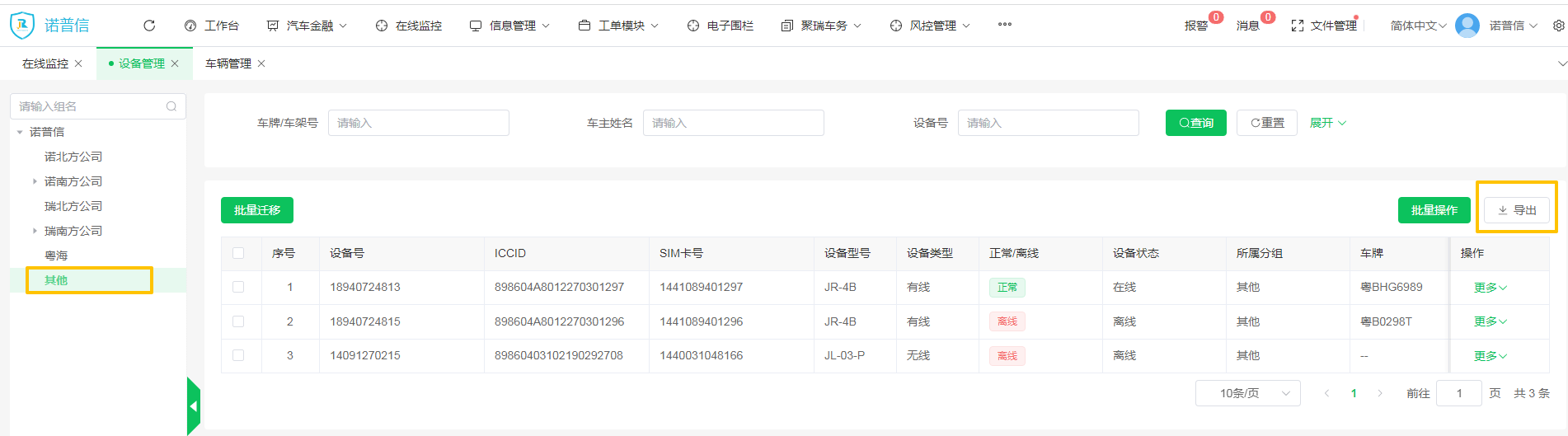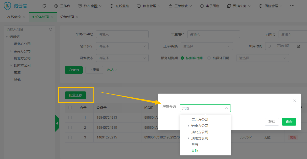 *注意:设备迁移部门后,其绑定的车辆会自动更新至新部门。