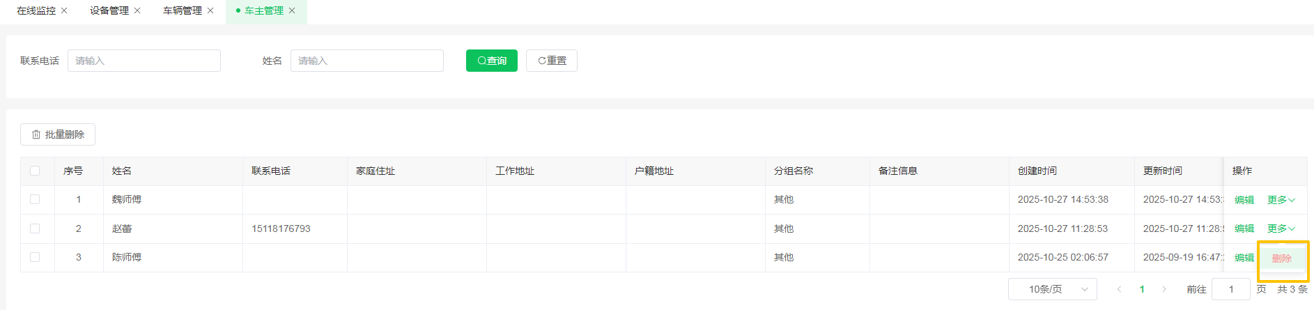 目录 搜索 WEB端操作说明登录工作台在线监控信息管理车辆管理设备管理车主管理电子围栏系统管理分组管理用户管理统计分析其他设置APP端操作说明下载与账户首页监控车辆管理设备管理报警列表围栏管理分组管理用户管理 暂无相关搜索结果! 版权所有 深圳田田云网络科技有限公司 车主管理 四、信息管理-车主管理此模块用于集中维护和管理与车辆关联的车主信息4.1编辑车主信息操作:在车主列表中,找到对应车主,点击其操作栏的 【编辑】 按钮。 4.2删除车主操作:在车主列表中,点击更多—>删除按钮注意:若该车主已绑定车辆,车主删除后,已绑定的车辆中车主信息则不显示。