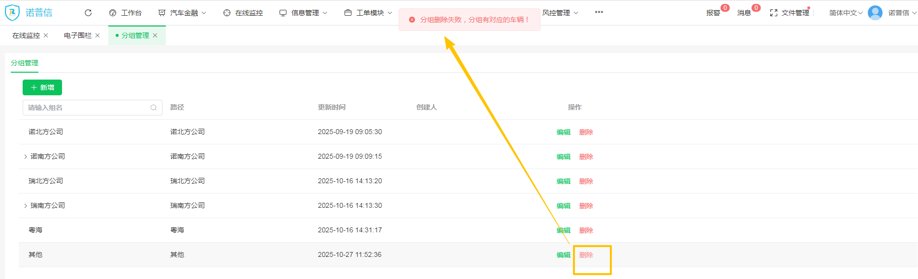 目录 搜索 WEB端操作说明登录工作台在线监控信息管理车辆管理设备管理车主管理电子围栏系统管理分组管理用户管理统计分析其他设置APP端操作说明下载与账户首页监控车辆管理设备管理报警列表围栏管理分组管理用户管理 暂无相关搜索结果! 版权所有 深圳田田云网络科技有限公司 分组管理 六、系统管理-分组管理分组管理用于构建企业的组织架构,实现对车辆、设备、权限的层级化管理。6.1新建分组操作步骤: 点击“新增”按钮选择上级分组及填写分组信息点击“确定”按钮 6.2编辑分组操作步骤: 点击“编辑”按钮修改分组信息点击“确定”按钮 6.3删除分组操作步骤:点击“删除”按钮注意:该分组下若存在车辆信息,则无法删除!