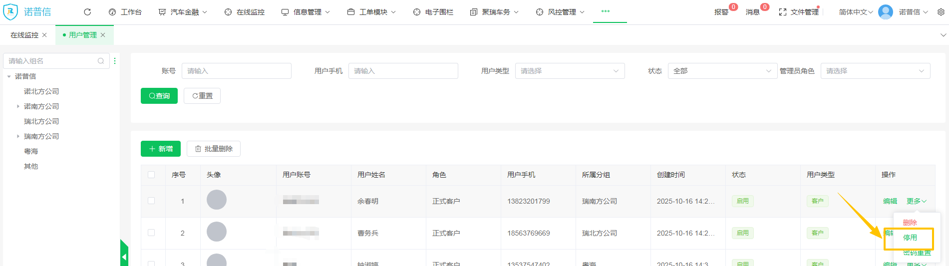 应用场景:当用户离职、休假或临时无权操作系统时,停用其账号比删除更安全可逆。禁用后,该用户将无法登录系统。