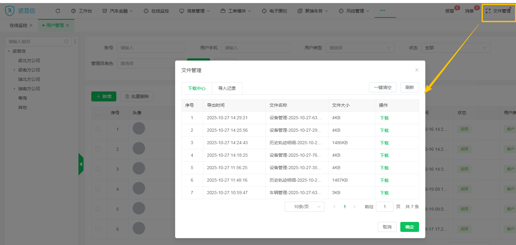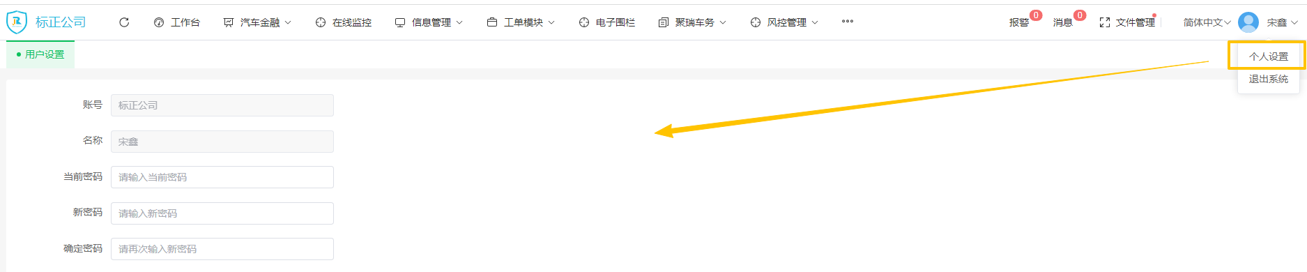 目录 搜索 WEB端操作说明登录工作台在线监控信息管理车辆管理设备管理车主管理电子围栏系统管理分组管理用户管理统计分析其他设置APP端操作说明下载与账户首页监控车辆管理设备管理报警列表围栏管理分组管理用户管理 暂无相关搜索结果! 版权所有 深圳田田云网络科技有限公司 其他设置 修改密码操作步骤: 点击头像下拉图标——>个人设置填写原密码及新密码点击确定 文件管理应用场景:用于导出该系统中已下载的所有报表。