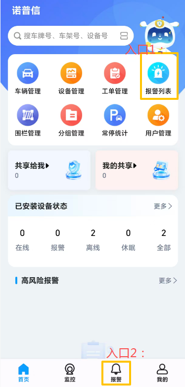 - 首页快捷入口点击【报警列表】