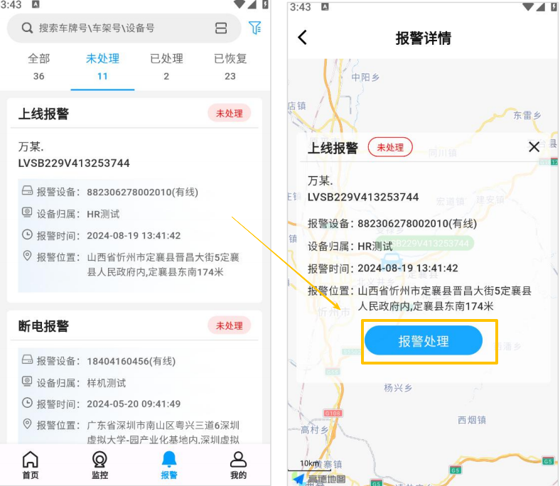 查看报警信息—>选择处理方式—提交