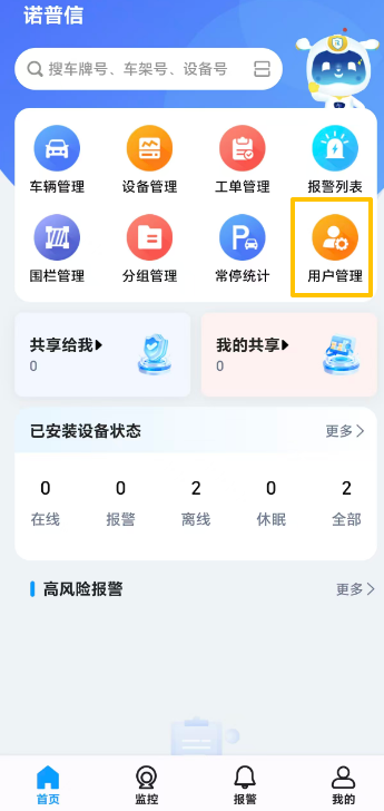 目录 搜索 WEB端操作说明登录工作台在线监控信息管理车辆管理设备管理车主管理电子围栏系统管理分组管理用户管理统计分析其他设置APP端操作说明下载与账户首页监控车辆管理设备管理报警列表围栏管理分组管理用户管理 暂无相关搜索结果! 版权所有 深圳田田云网络科技有限公司 用户管理 八、用户管理用于对平台用户进行管理和权限控制。 8.1新增用户点击【新增】按钮 —>填写用户相关信息—>选择所属分组—>保存 8.2用户禁用/启用选择任意用户进入详情页 —>点击”禁用”/“启用”按钮 —>提示操作成功 8.3重置密码选择任意用户进入详情页 —>点击”重置密码”按钮 —>提示操作成功
