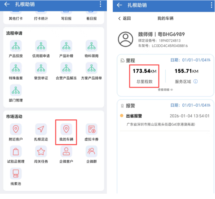 目录 搜索 WEB端操作说明登录工作台在线监控信息管理车辆管理设备管理车主管理电子围栏系统管理分组管理用户管理统计分析其他设置APP端操作说明下载与账户首页监控车辆管理设备管理报警列表围栏管理分组管理用户管理我的车辆里程 暂无相关搜索结果! 版权所有 深圳田田云网络科技有限公司 我的车辆里程 查看车辆里程入口:扎根助销系统【首页】—【市场活动】模块—【我的车辆】—【总里程数】