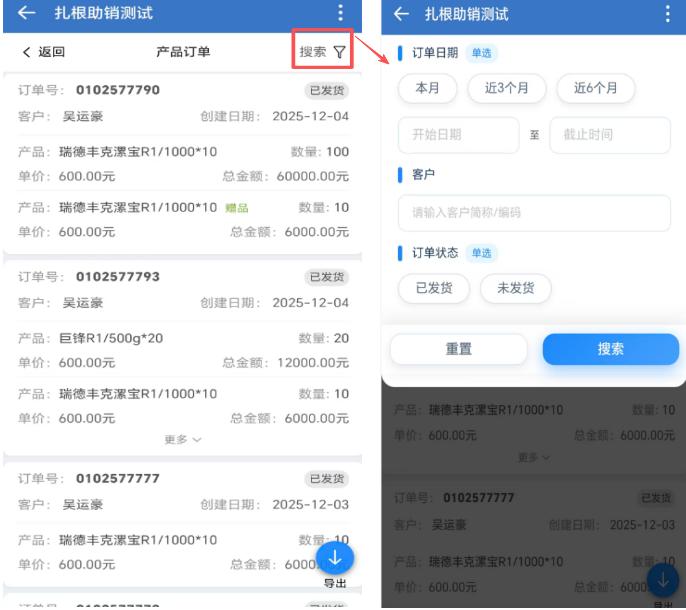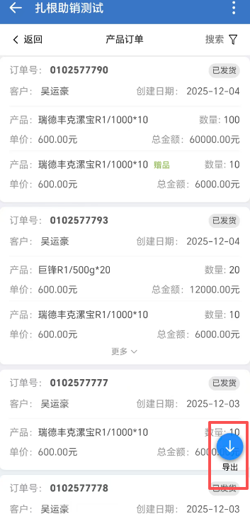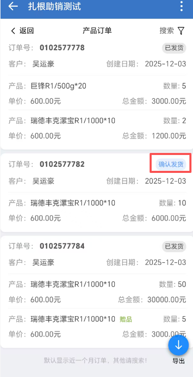 目录 搜索 常见问题经销商或零售店界面没有显示全部数据无法进入系统/界面点击无反应/界面显示空白扎根动作/外勤打卡无法定位微信清理缓存未分配职位的员工或实习生如何进行外勤打卡如何新建经销商下的直属大农户新增有效农户线索池企业微信添加常用应用添加客户发客户朋友圈创建群聊客户统计(管理员)配置欢迎语(管理员)闯关任务(扎根助销)信用额申请卡券活动操作视频扎根助销系统操作视频外勤打卡操作视频扎根助销系统操作手册经销商-线路货源供需市场部订单试验品管理零售店大农户示范田会销经销商 零售店 大农户列表驾驶舱日报扎根足迹动态会销工具经销商卡券营销市场投放原点农户标准化配置原点任务原点农户打标签查看原点任务查看原点农户任务达成完成示范田任务完成巡田任务完成转介绍任务完成添加微信任务完成大户会/势能会任务完成订购任务原点农户完善资料部门管理挂靠(定岗)异动兼任 暂无相关搜索结果! 版权所有 深圳田田云网络科技有限公司 市场部订单 一、产品订单入口扎根助销系统底部导航—>【产品订单】 二、产品订单列表 列表默认展示近一个月内订单数据列表数据显示订单号、订单日期、产品信息、发货状态等发货状态中【确认发货】按钮点击后,状态更新为【已发货】发货状态释义:产品经理通知供应商发货后,可点击【确认发货】按钮,则订单状态变更为【已发货】 三、产品订单搜索点击右上角【搜索】图标,可根据【订单日期】【客户名称】【订单状态】查询数据 四、产品订单导出以上查询出的数据,点击页面中【导出】图标,可导出excel表格