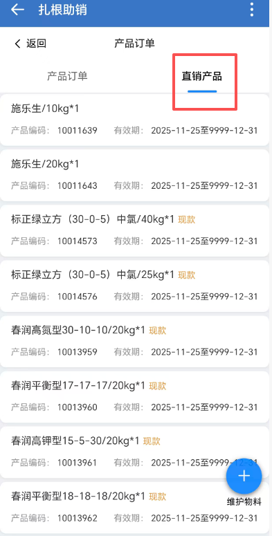 进入产品订单页面后,切换至【直销产品】列表