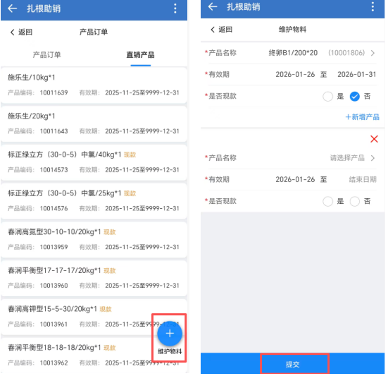 2. 选择产品、填写有效期、是否现款信息,